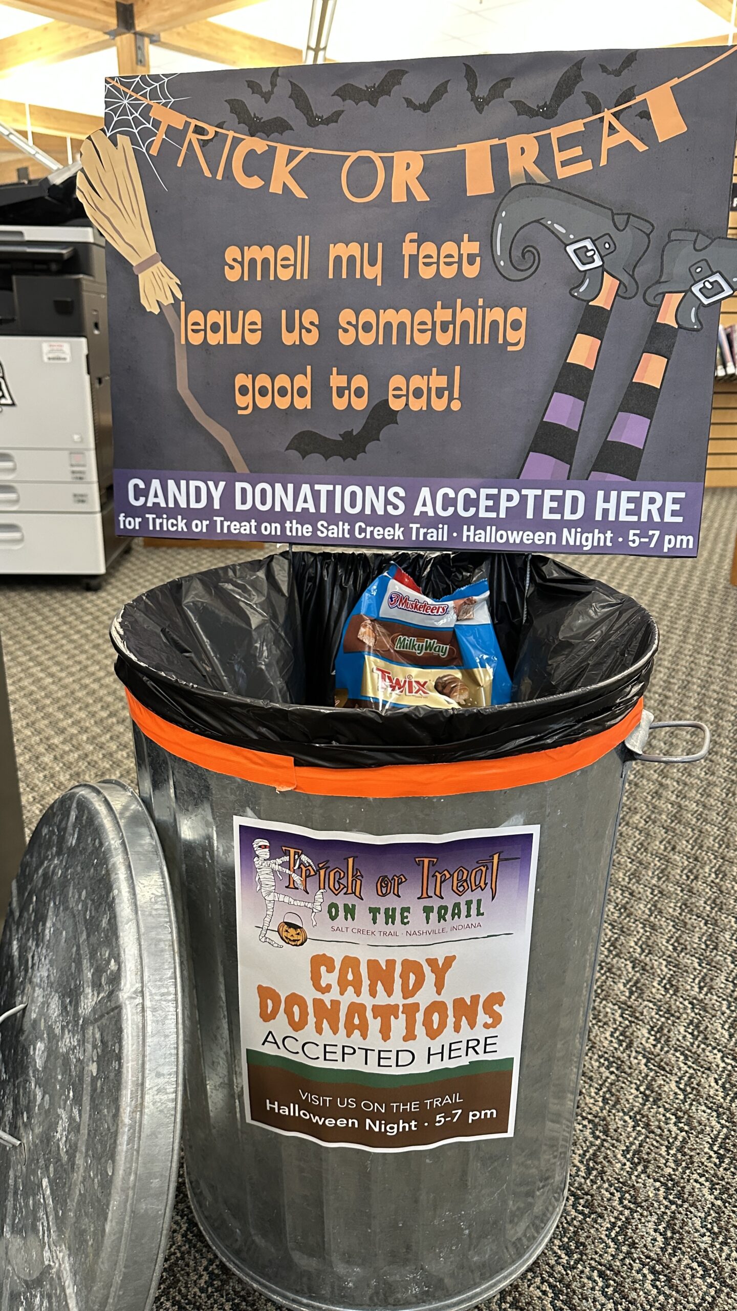 The Library is currently collecting donations of individually wrapped candy to distribute on Halloween night during the annual Trick or Treat on the Salt Creek Trail. Donations can be added to the pail upstairs by the check out desk, or dropped off at the Brown County YMCA or Brown County Parks & Rec offices.